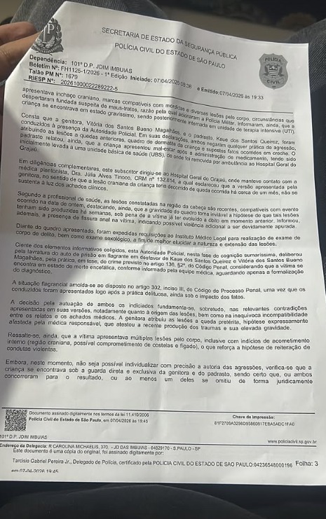 As investigações apontam a mãe da criança e seu atual namorado, identificado como Kauê Santos Queiroz, como os principais suspeitos das agressões.