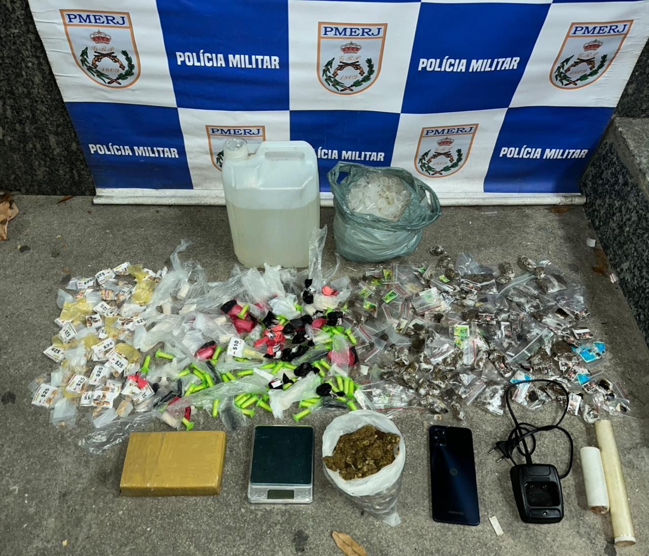 Também foram recolhidos um celular, um carregador de rádio comunicador, uma balança de precisão e grande quantidade de material utilizado para endolação de drogas.