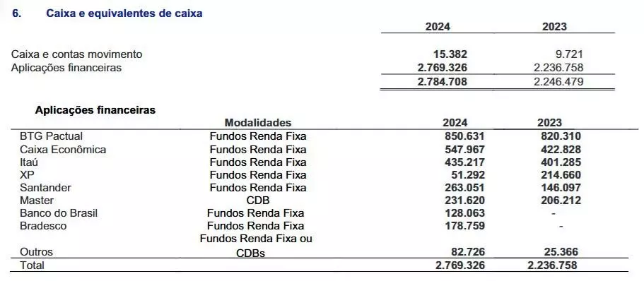 De acordo com o balanço financeiro de 31 de dezembro de 2024, o montante representava 8,4% de toda a carteira de investimentos da companhia, superando os volumes mantidos em bancos de grande porte, como Bradesco (R$ 178,7 milhões) e Banco do Brasil (R$ 128 milhões). A aplicação não tinha diversificação de risco: em caso de instabilidade da instituição, como ocorreu, os recursos ficariam bloqueados.
